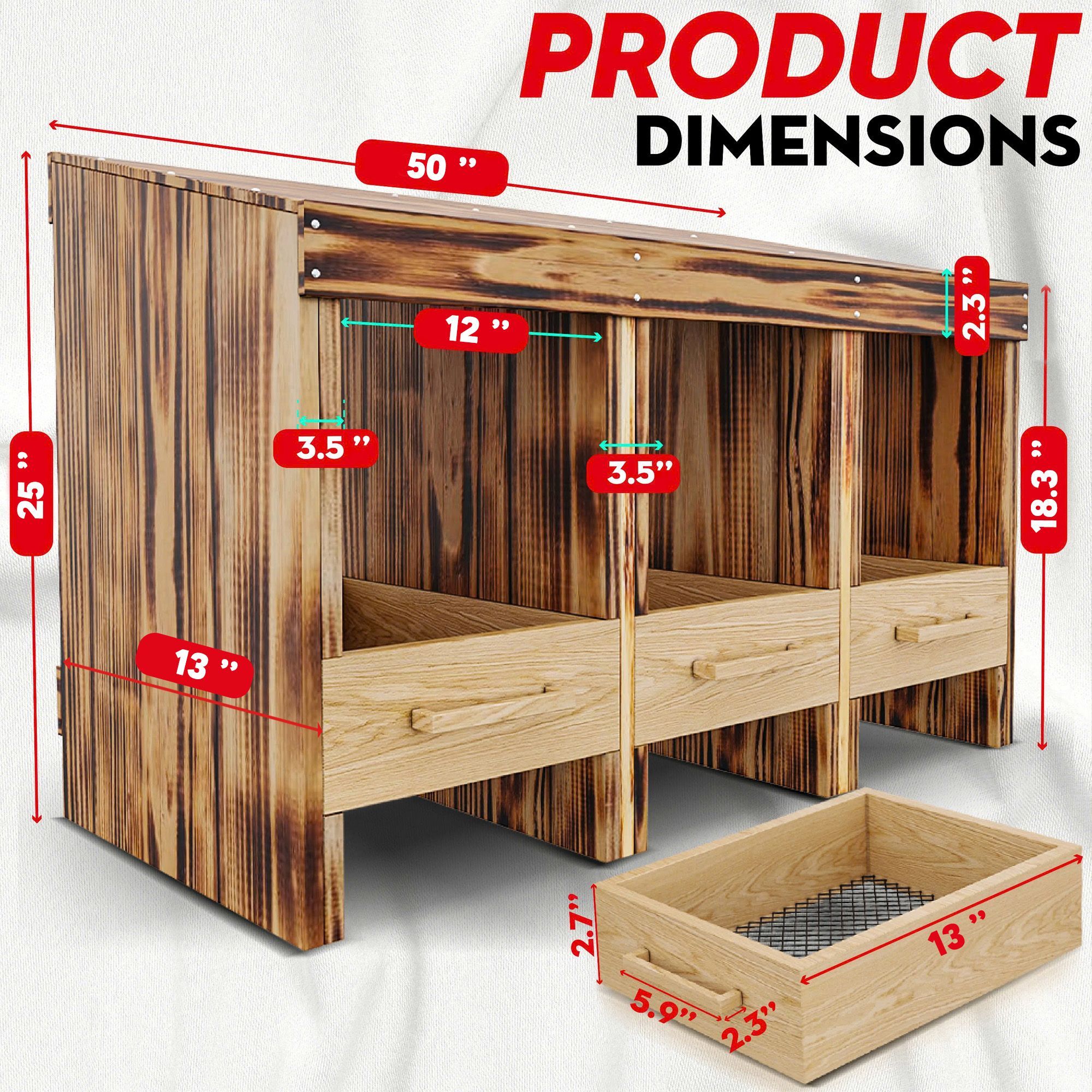 Den faste grantrækramme og 1,5 cm brættykkelse sikrer en robust, langvarig struktur. FIR er en blødtræ af høj kvalitet, der er meget brugt i udendørs konstruktion for sin naturlige styrke og lige korn. For at forbedre holdbarheden er hvert træpanel først carboniseret (dybt skåret) i en traditionel proces. Denne dybe forkulling komprimerer træets overfladeceller og beskytter mod fugt og UV -skade. Endelig påføres en miljøvenlig vandbaseret malingsfrakke som et fugemasse. Denne vandafvisende finish tilføjer et ekstra lag af beskyttelse mod regn og vejr, bevarer coopens udseende og forlænger dens levetid.